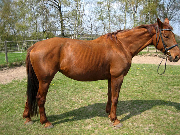 • Eine leicht gebaute 12 jährige Stute vor dem Trainingsbeginn im Mai. Das Pferd wird beim Reitunterricht eingesetzt. Hier galt es viel innere und äußere Spannung abzubauen, dem Pferd ein wenig mehr Selbstbewußtsein zu geben sowie die richtigen Muskeln zum Tragen des Reiters zu entwickeln.